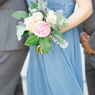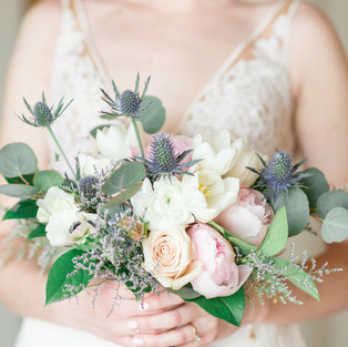 The flowers comprised white / dark anemones, dusty miller, silver dollar eucalyptus, blush peonies (Ann Cousins Mother), cream roses (Sahara), salal lemon leaf tips, blue thistle & white tulips.